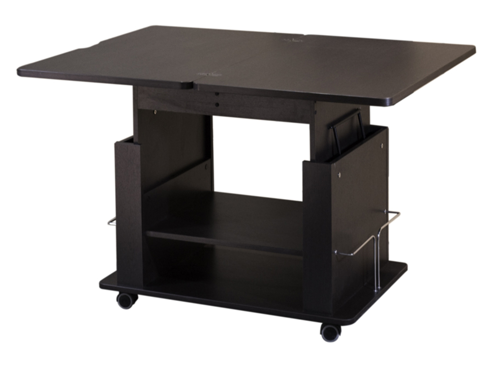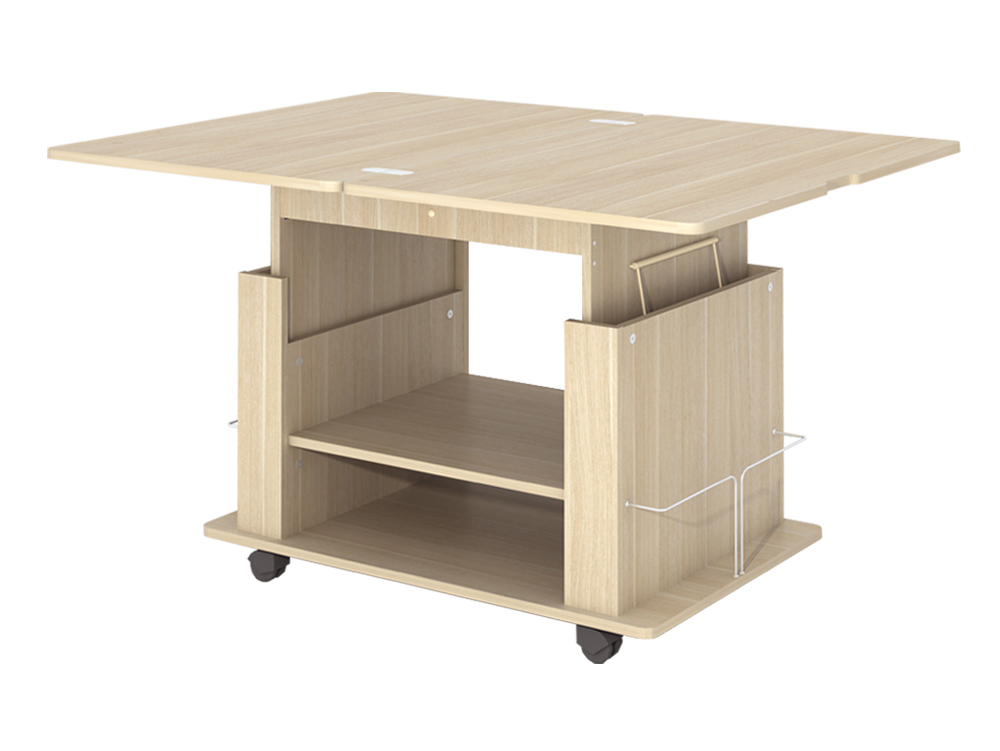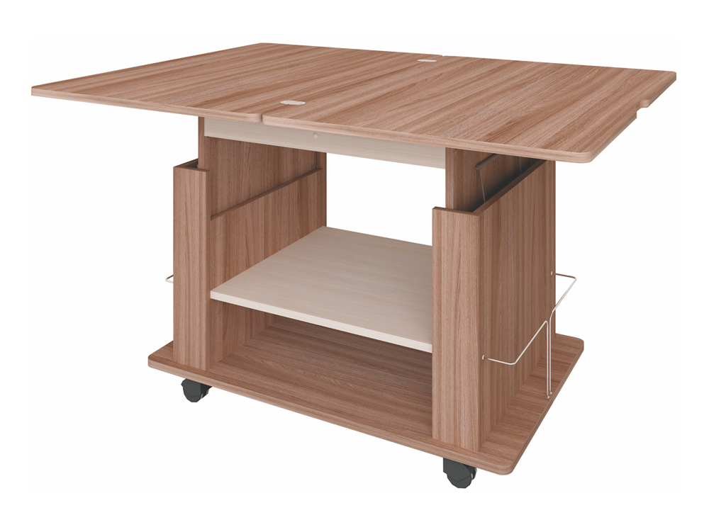 «Агат 19.2» – многофункциональный стол, который может использоваться в различных положениях, представленных на схемах. Это достигается за счет наличия подъемного и поворотного механизмов, которые превращают журнальный стол в обеденный. Данную модель дополняет металлическая газетница и ниша для хранения мелочей.