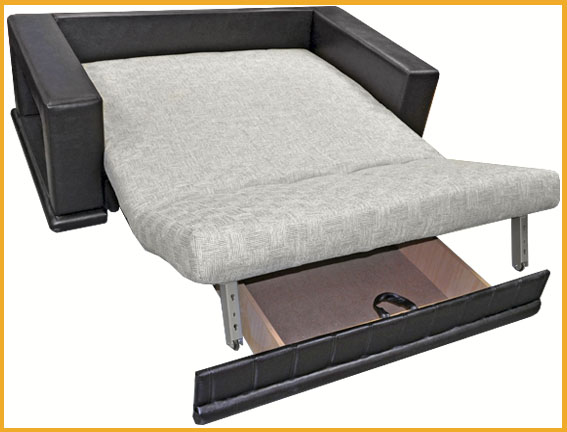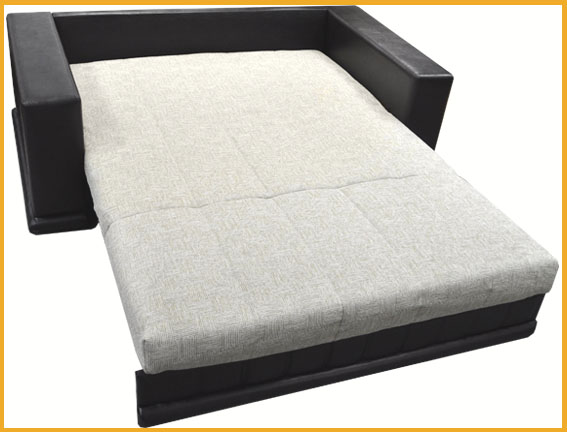 Современный стиль. Ровное спальное место. В основании дивана металлический каркас с поддерживающими деревянными латами и механизмом трансформации «аккордеон». Матрас на эластичном ППУ. Спальное место формируется следующим образом: цокольная часть сиденья выдвигается вперед до упора, спинка, состоящая из сложенного листового пенополиуретана, раскладывается. Для трансформирования не требуется расстояние между стеной и диваном. Съемный чехол на спальном месте.Мягкие прямолинейные подлокотники, в нише которых крепятся вставки из ЛДСП. Имеется небольшая емкость для хранения спальных принадлежностей.