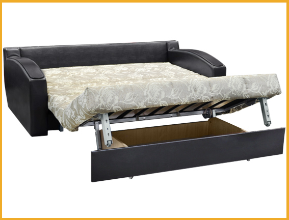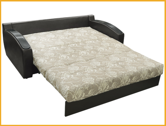 Современный стиль. Ровное спальное место. В основании дивана металлический каркас с поддерживающими деревянными латами и механизмом трансформации «аккордеон». Матрас на эластичном ППУ. Спальное место формируется следующим образом: цокольная часть сиденья выдвигается вперед до упора, спинка, состоящая из сложенного листового пенополиуретана, раскладывается. Для трансформирования не требуется расстояние между стеной и диваном. Съемный чехол на спальном месте.Изящные криволинейные подлокотники выполнены с декоративными накладками. Имеется небольшая емкость для хранения спальных принадлежностей.Комплектуется декоративными двухсторонними подушками.
