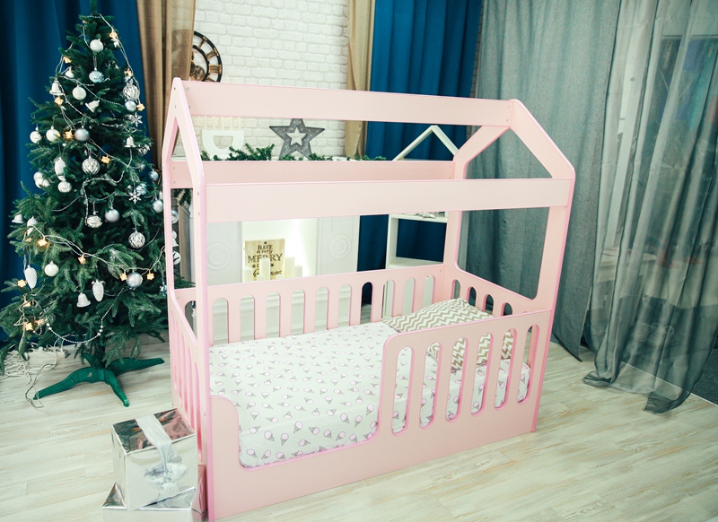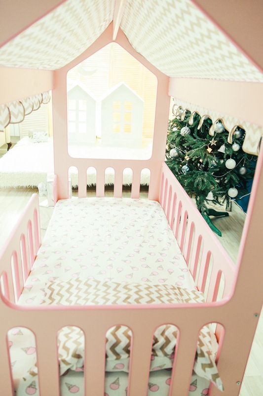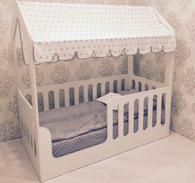 Под заказ можно дополнить домик кроватку аксессуарами: балдахин на крышу, комплект постельного белья, комплект шторы (2 шторы + 2 завязки)