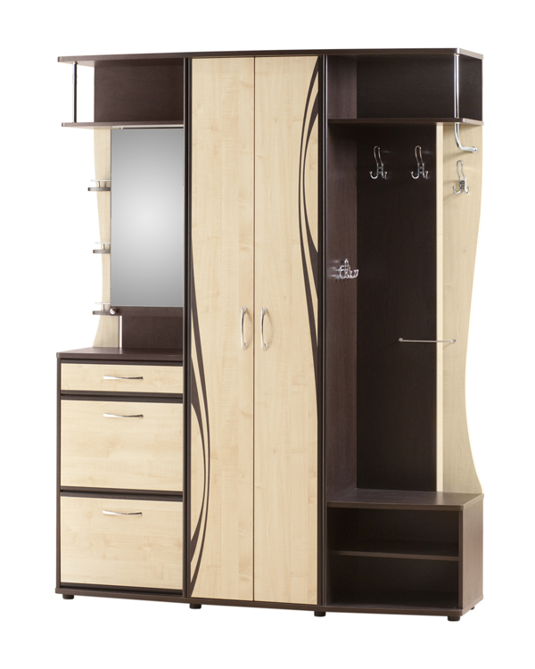 Функциональное наполнение данной модели разработано с учетом пожеланий покупателей. В ней есть вместительные полки для головных уборов, панель с крючками, шкаф для хранения верхней одежды, полки и тумба для обуви.