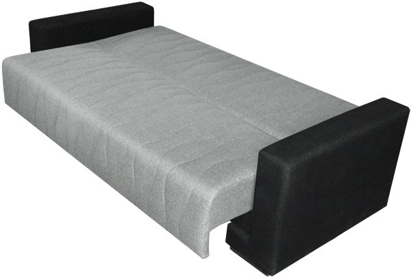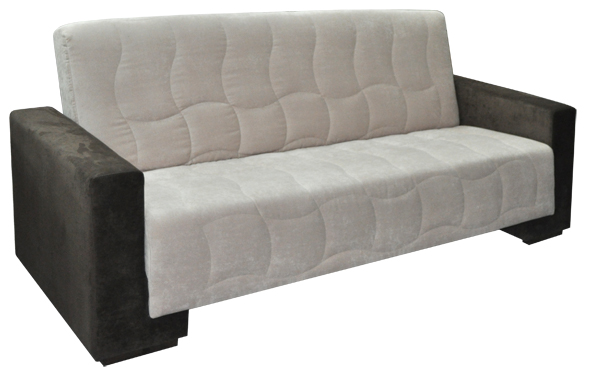 Современный строгий стиль.Прямоугольные подлокотники. Простеганный на синтепоне чехол. Декоративные опоры из МДФ. В основании спинки и сиденья деревянная рамка с латами, на которую кладется пружинный блок с настилом из термовойлока и эластичного листового пенополиуретана.В коробчатом основании дивана расположена емкость для хранения спальных принадлежностей.Для трансформации требуется небольшое расстояния между стеной и диваном.Механизм раскладки "книжка".