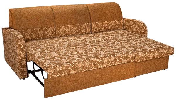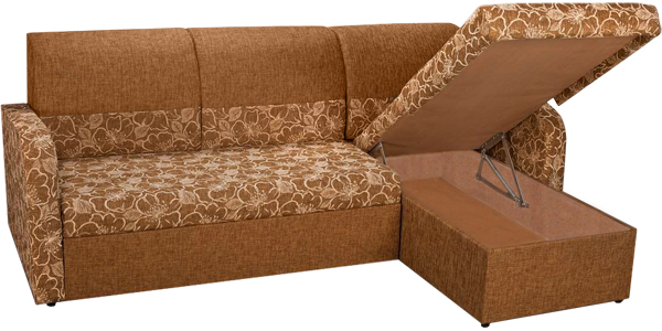 Ровное спальное место, оснащенное механизмом трансформации "Дельфин". Особенностью данного дивана является его узкие подлокотники и декоративные сшивные чехлы из двух видов ткани на приспинных подушках и подлокотниках. Матрас из высокоэластичного ППУ. Возможность использования как центральный объект интерьера при условии дополнительного заказа задников из обивочной ткани. При трансформации, диван находится вплотную к стене, раскладка производится в переднем направлении. В коробе оттоманки расположена емкость для постельных принадлежностей. Угол дивана трансформируется.