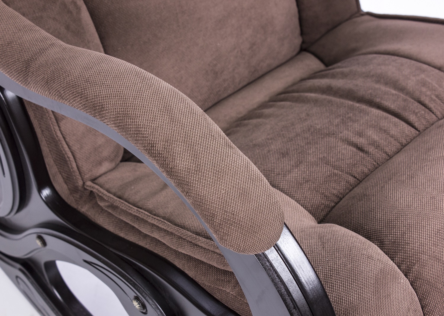 Боковины и подлокотники классического дизайна изготовлены из дерева. Кресло-качалка имеет удобную подножку. Особый комфорт создают эргономичная форма сиденья и спинки.