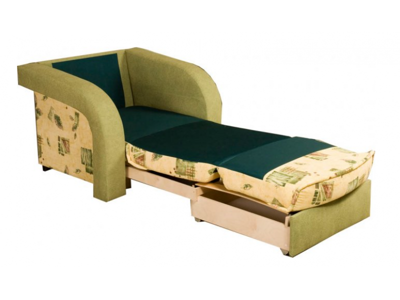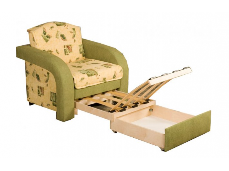В основе – каркас с поддерживающими латами и механизмом трансформации типа «аккордеон». Спальное место образуется следующим образом: сиденье выдвигается в перед, спинка, состоящая из сложенного листового пенополиуретена, раскладывается. Настил мягких элементов выполнен из эластичного пенополиуретана не ниже 25 плотности. Имеется емкость для хранения постельных принадлежностей.