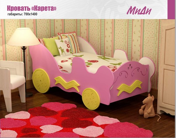 Кровать изготавливается из МДФ, цветные элементы выполнены в виде МДФ накладок, которые надежно закреплены к основным частям изделия уже на фабрике. Основание кровати Фанерные «латы» на тесьме, раскладываются на бруски прикрепленные к боковым элементам кровати изнутри и фиксируются на саморезы. Колеса собираются на стяжку в центре и изнутри фиксируются саморезами, т.е. кровать на колесах не передвигается