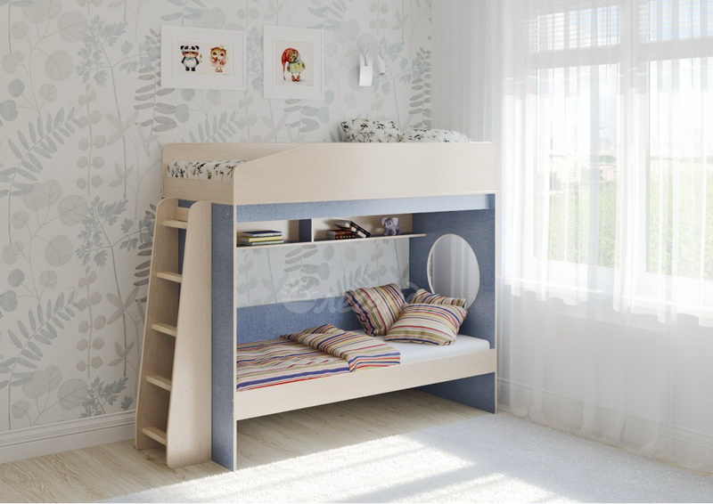 Над нижним спальным местом располагается встроенная двухсекционная полка, в которой удобно хранить книги, учебники, тетради, канцелярию и другие нужные вещи.