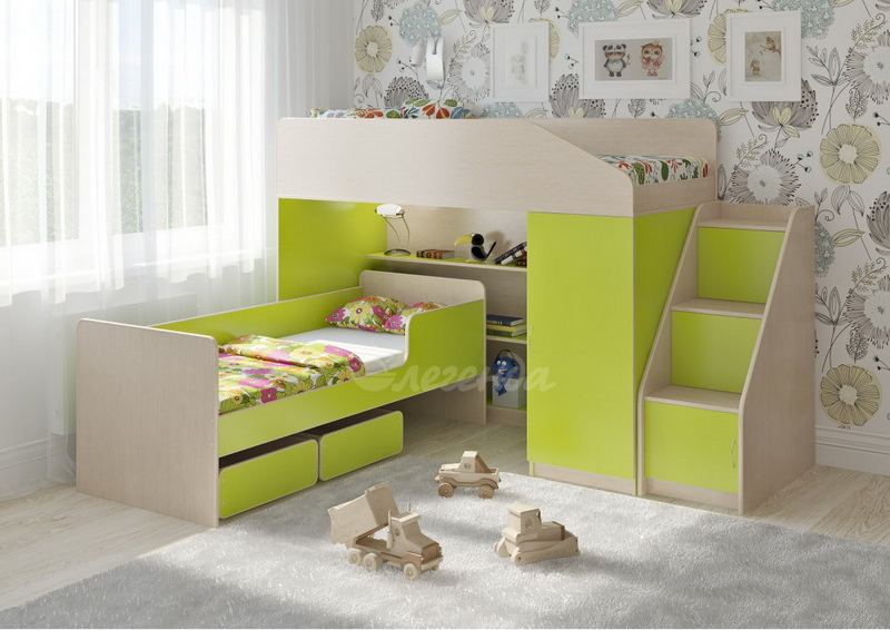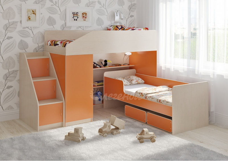 Под верхним спальным местом располагается стеллаж,состоящий из трех полок.Стеллаж отлично подходит для хранения игрушек,удобен для поддержания порядка и сортировки предметов.