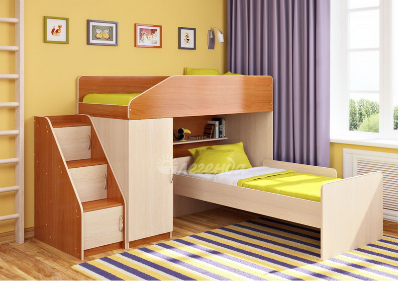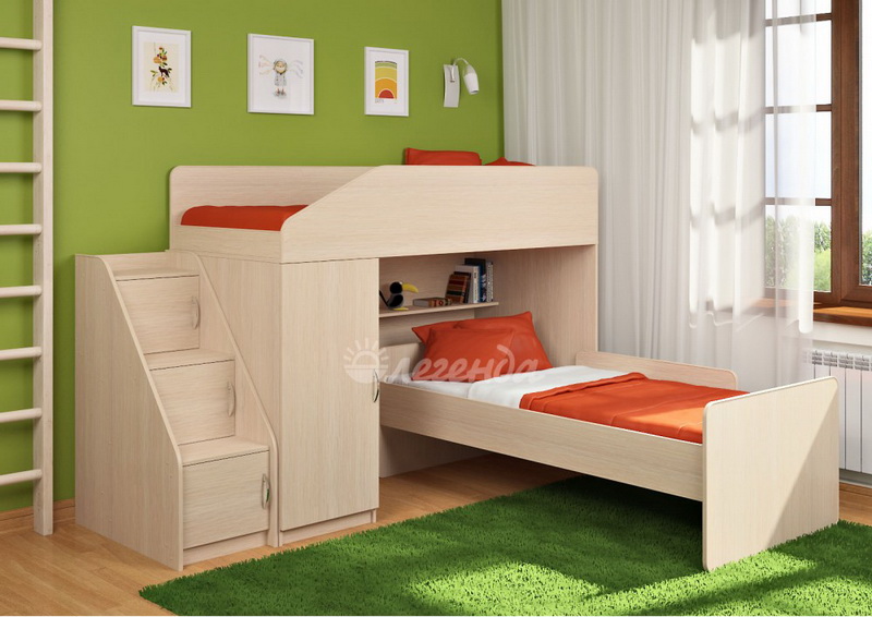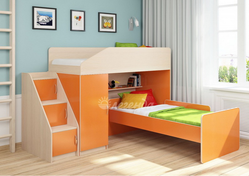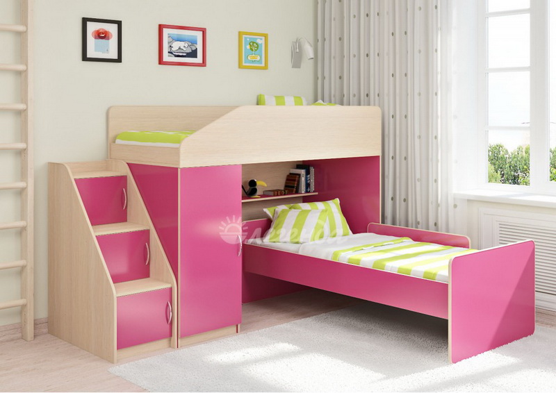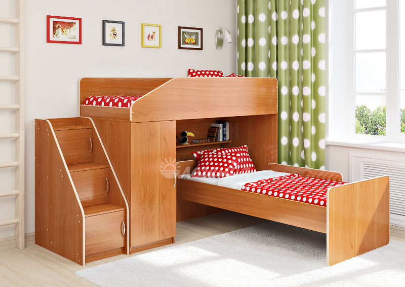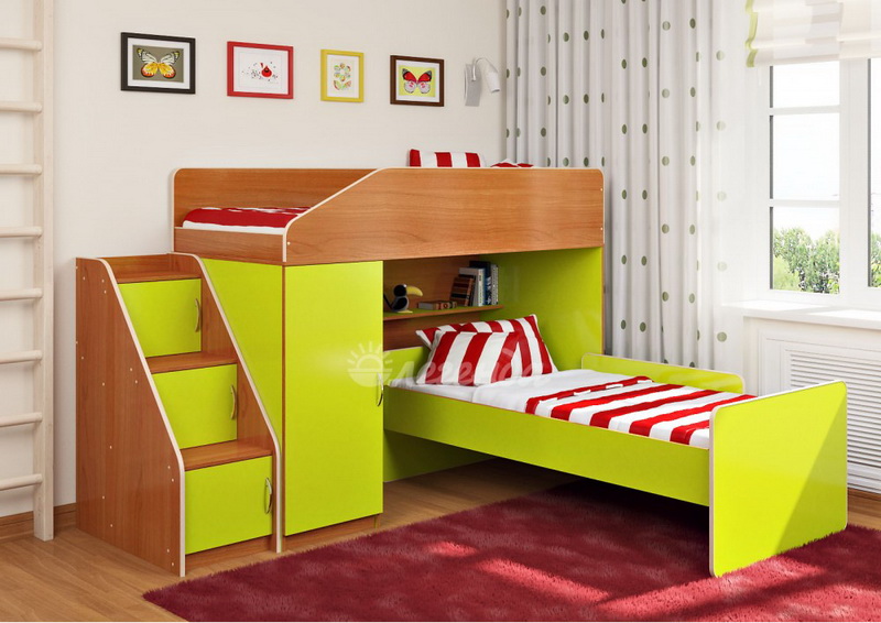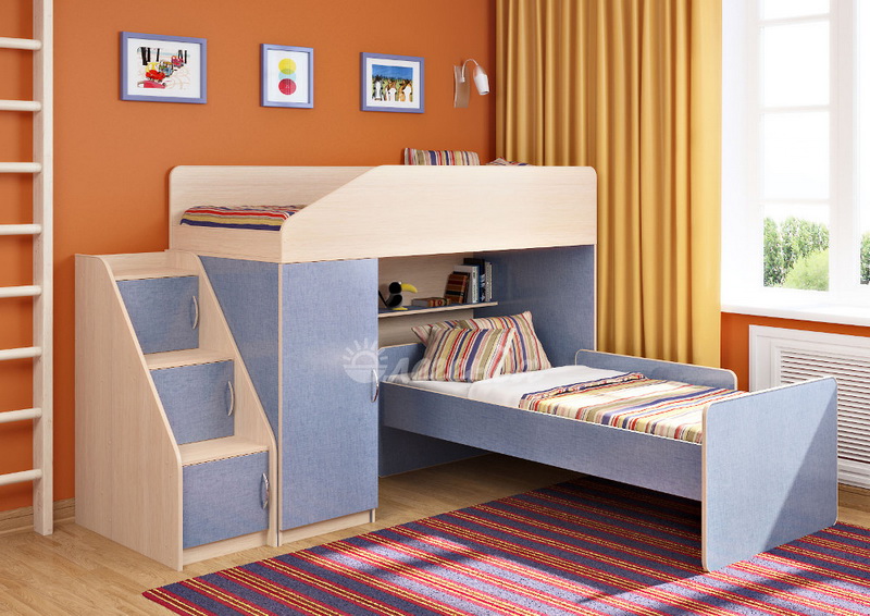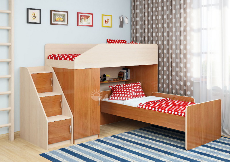 Под верхним спальным местом в игровой зоне располагается стеллаж,состоящий из трех полок.Стеллаж отлично подходит для хранения игрушек,удобен для поддержания порядка и сортировки предметов.