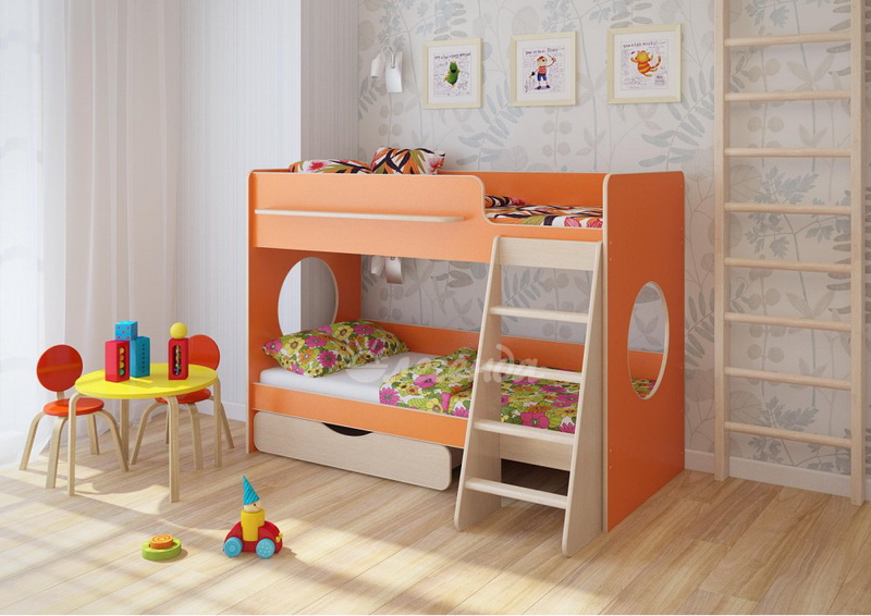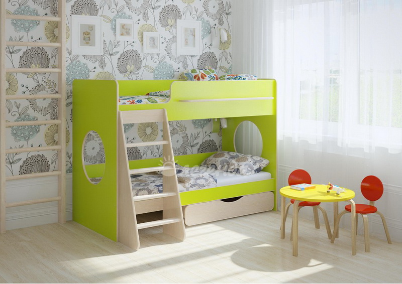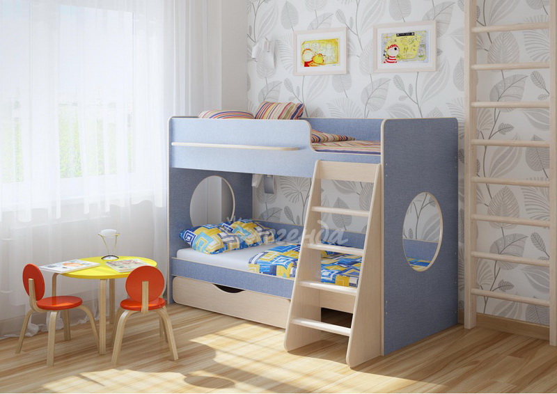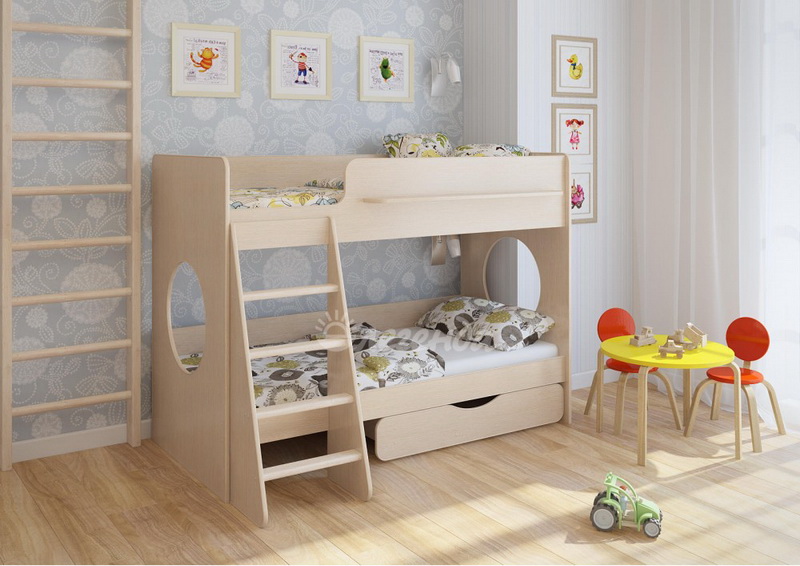 Классическая детская невысокая двухъярусная кровать с двумя параллельными спальными местами размером 1800х800.