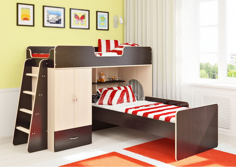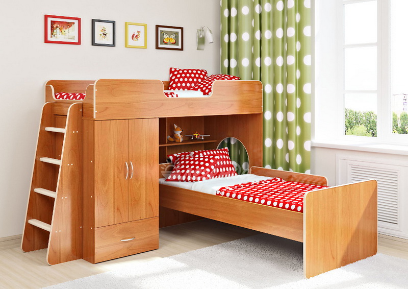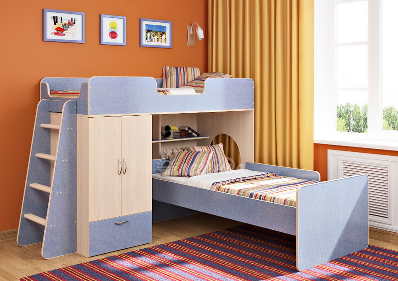 Под верхним спальным местом в игровой зоне располагается стеллаж,отлично подходящий для хранения игрушек.