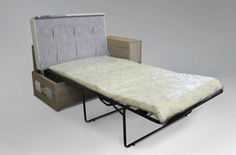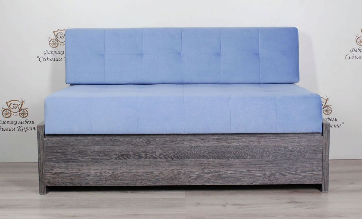 - Модель со спальным местом. Диван имеет механизм трансформации «французская раскладушка». Механизм трансформации весьма прост и требует минимальных усилий: достаточно снять подушку и поднять конструкцию сиденья, после чего установленный горизонтально механизм раскладушки, разворачивается и устанавливается на опорные ножки. При раскрытии спального места ножки автоматически раскладываются и жестко удерживаются в перпендикулярной полу позиции с небольшим наклоном вперед. Этот механизм трансформации напоминает разворачивание свитка и обеспечивает дивану компактность в сложенном виде и достаточно просторное спальное место в разложенном.
