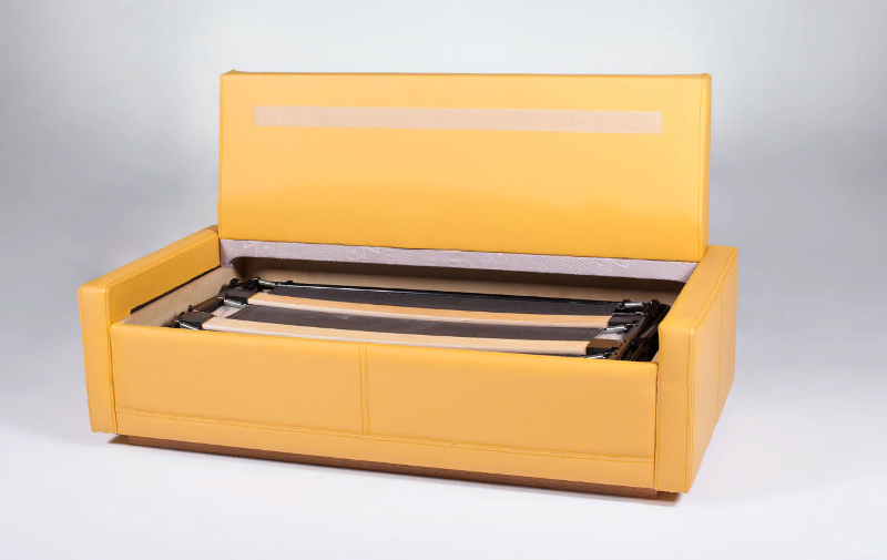Диван имеет механизм трансформации «французская раскладушка» Механизм трансформации весьма прост и требует минимальных усилий: достаточно снять подушки и поднять конструкцию спального места за специальную ручку в передней части раскладушки, после чего, установленный горизонтально механизм раскладушки дважды разворачивается и устанавливается на опорные ножки. При раскрытии раскладушки, ножки автоматически раскладываются и жёстко удерживаются на полу с небольшим наклоном вперёд. Данный механизм трансформации обеспечивает дивану компактность в сложенном виде и достаточно просторное спальное место в разложенном.