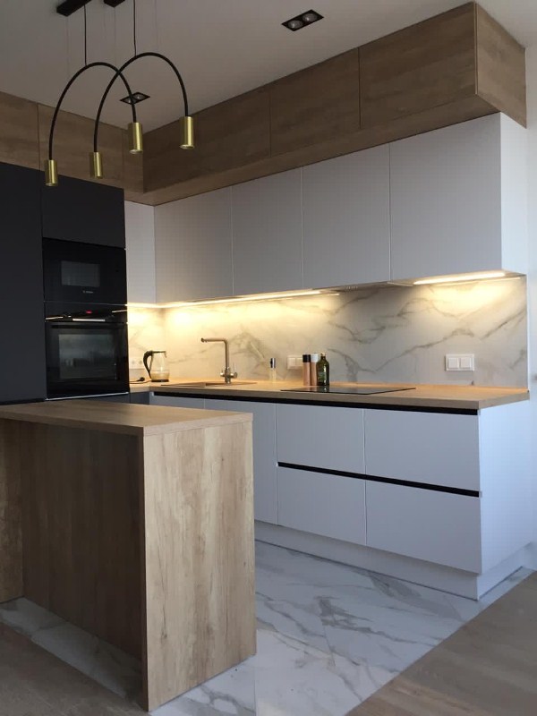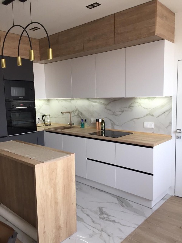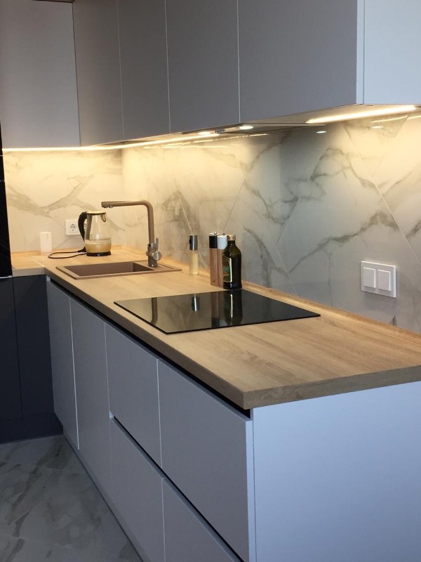 К кухне можно заказать фартук (мебельный щит) ХДФ с фотопечатью, стекло с фотопечатью либо фартук в цвет столешницы.