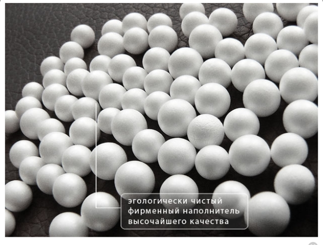 Внешний чехол полностью снимается для стирки, боковая молния на внешнем чехле закрыта планкой для эстетичного вида изделия. Наполнителем служат гранулы пенополистирола.