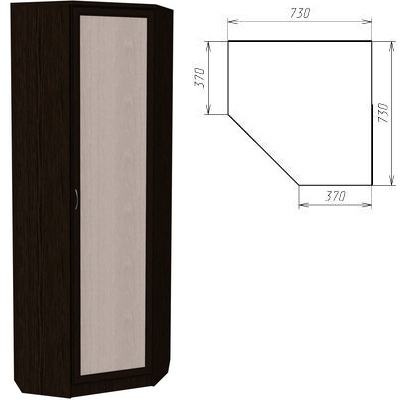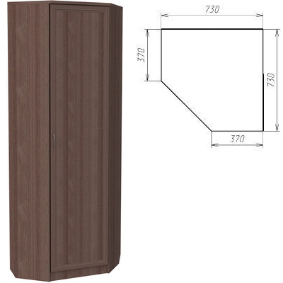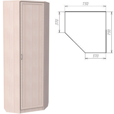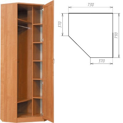 Небольшой, однодверный угловой шкаф, который предназначен для размещения в спальне, гостиной или коридоре, там, где есть желание занять угол полезным предметом мебели. Внутри шкаф оборудован надежной штангой и полками, где разместится не только одежда, но и обувь, аксессуары.