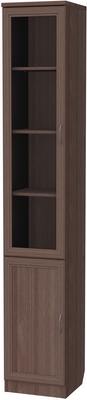 Шкаф разделен на две части. Верхняя часть спроектирована с застекленной дверцей и четырьмя полочками. Полочки одинаковые по размеру и находятся на равном расстоянии одна от одной. Расположены они таким образом, чтобы в шкафу было удобно хранить не только обычного формата книги, но и большие по размерам печатные издания или папки с документами (что очень удобно, если шкаф приобретается для использования в офисе). Благодаря внушительному объему, на полочках можно хранить большое количество книг.