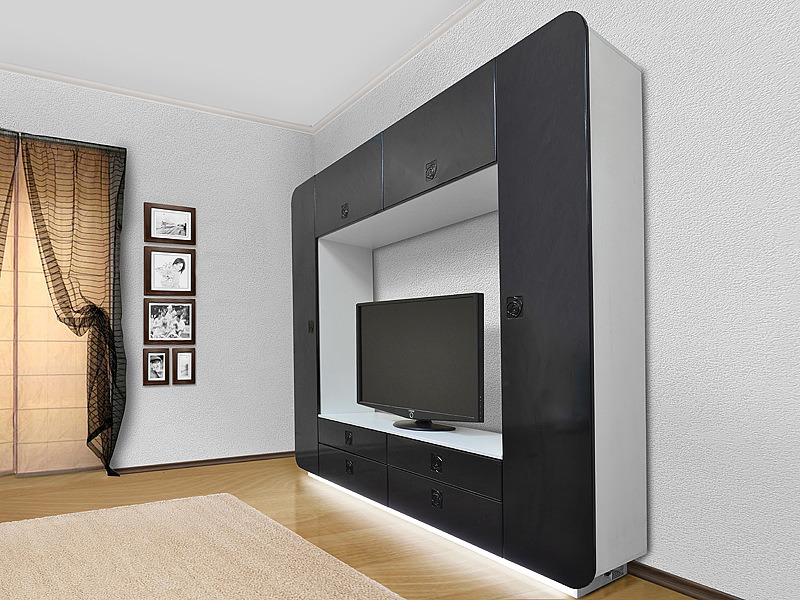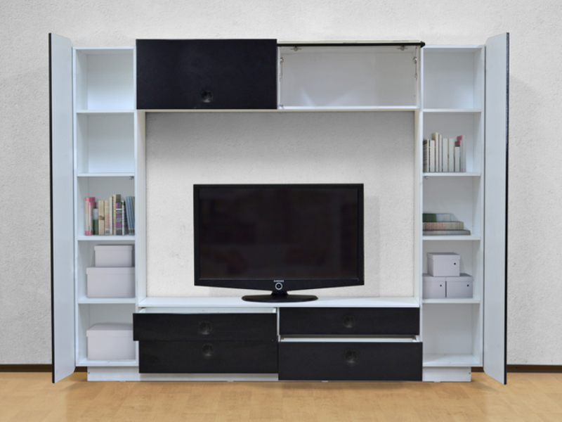 • Ниша под телевизор размером 160х110 сантиметров, которая позволяет разместить экран любой диагонали. • Два шкафа с распашными дверями шириной 40 сантиметров и 5 полками внутри. • Четыре выдвижных ящика шириной 80 сантиметров и глубиной 37 сантиметров для мелких предметов. Здесь могут разместиться пульты от телевизора и другой техники или домашняя аптечка. • Два больших ящика над нишей с откидными дверями шириной 80 и выстой 42 сантиметра для хранения объемных вещей. Ящики и дверцы снабжены механизмом "Push-to-open" и направляющими полного выдвижения . Корпус стенки изготавливается из ЛДСП белого цвета, а фасады из МДФ контрастного черного цвета, что делает стенку ультрасовременной и стильной.
