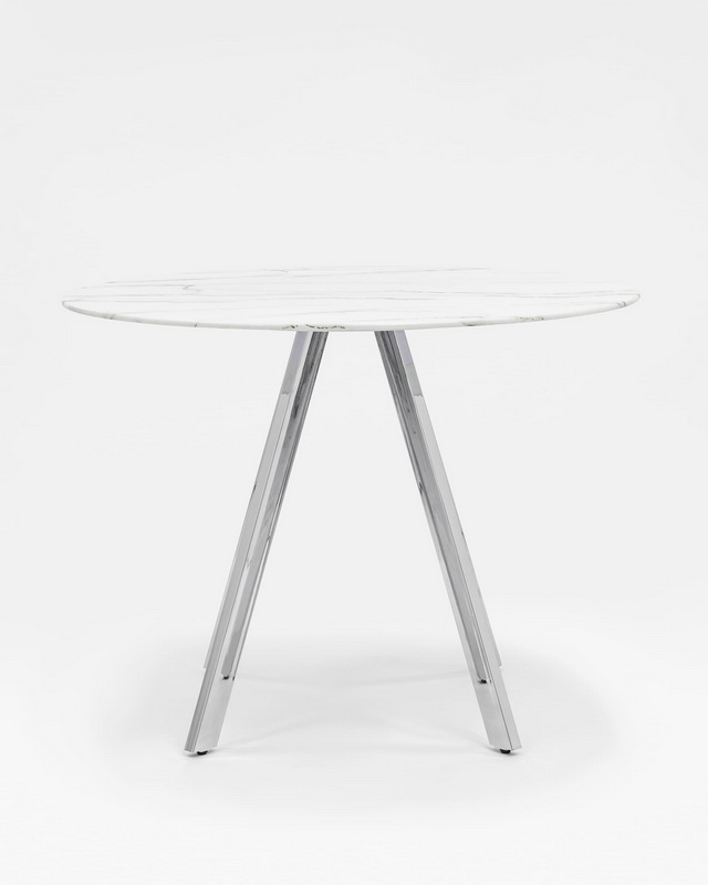 Обеденный стол с красивой стеклянной круглой столешницей белого цвета с рисунком под мрамор. Диаметр столешницы 100 см.