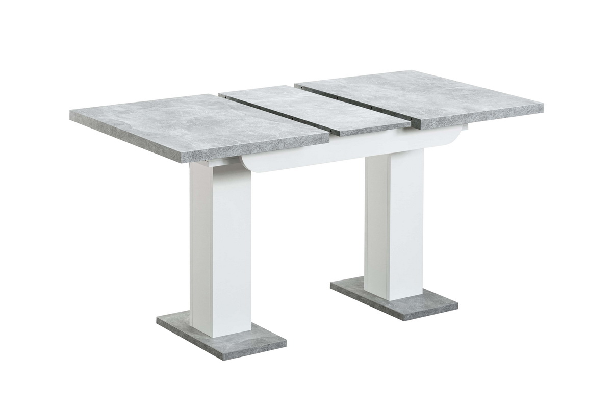 Столешница цвета бетона, ножки стола белые. Стол легко раскладывается до 166 см.