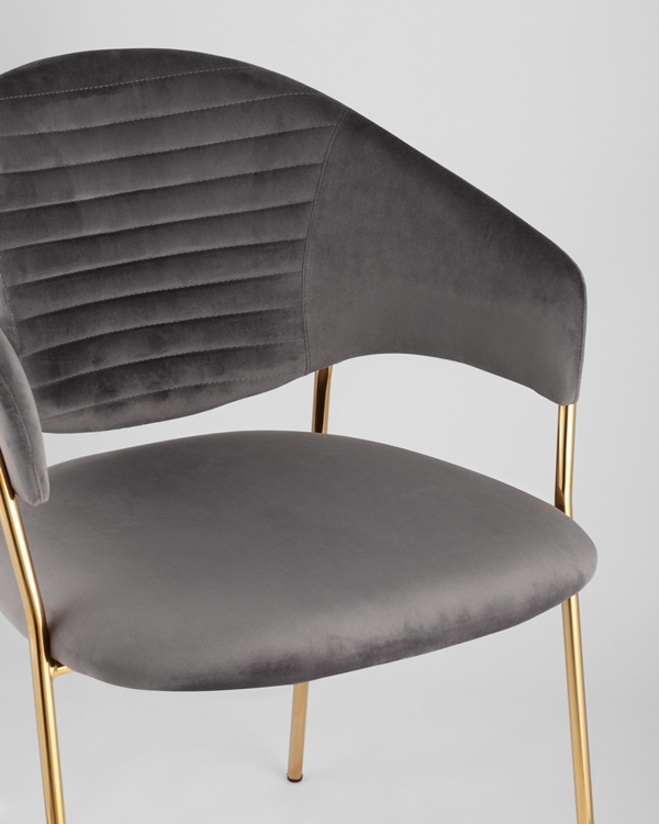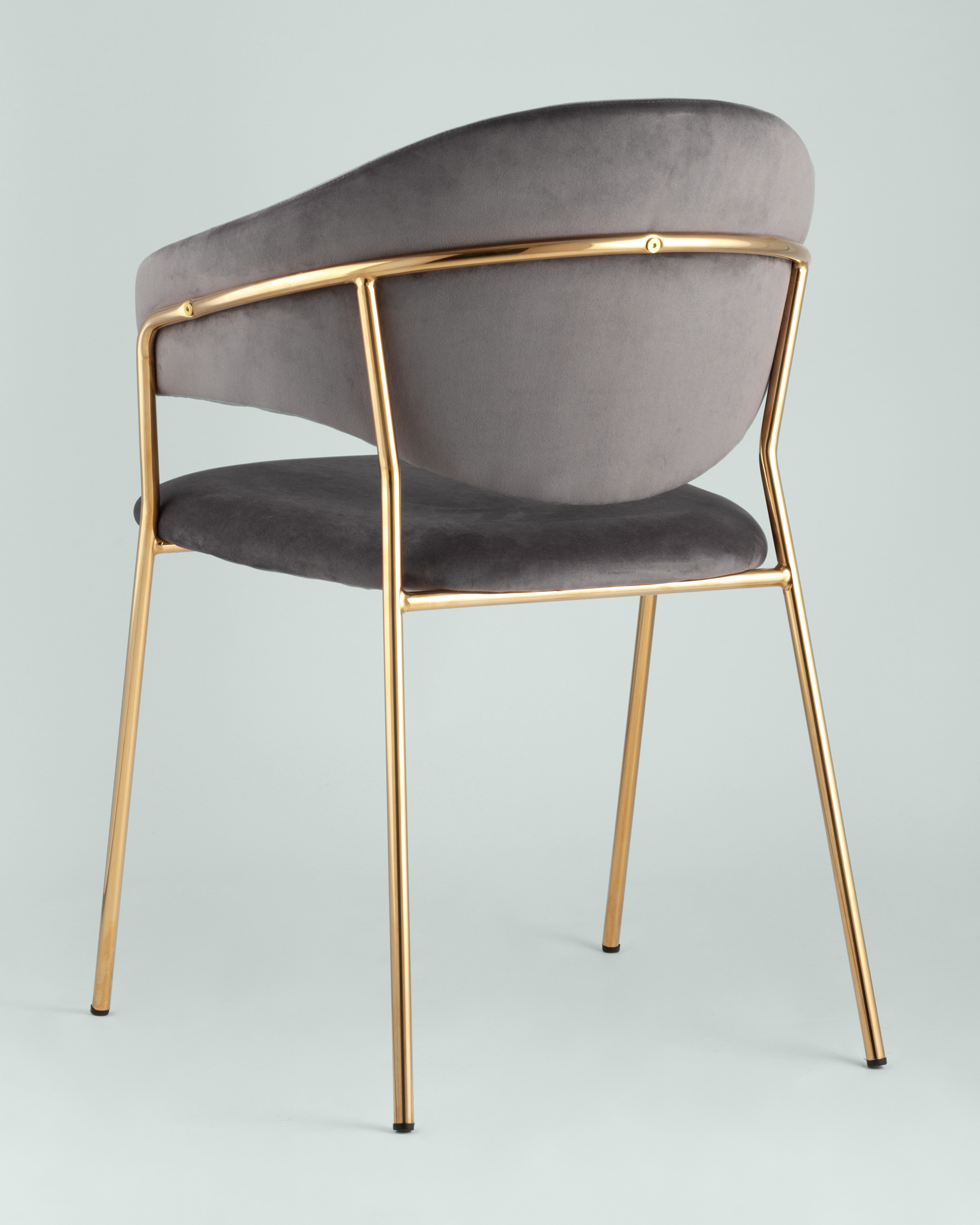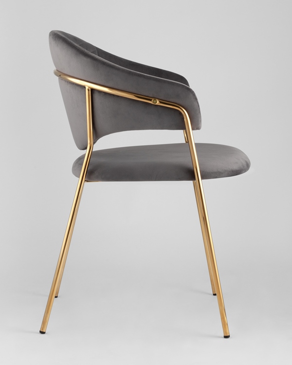 Стильный мягкий стул с подлокотниками и ножками золотого цвета.