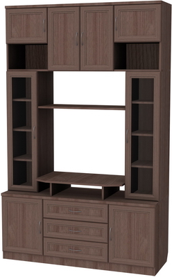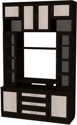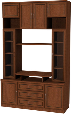 Основное предназначение тумбы, как это понятно из названия – создать комфортную зону для просмотра ТВ. Большая центральная ниша позволяет установить в ней даже самый большой экран. Под полками для ТВ есть небольшая ниша для размещения проигрывателя дисков. Над телевизором предусмотрена полка для фотографий и всевозможных элементов декора.