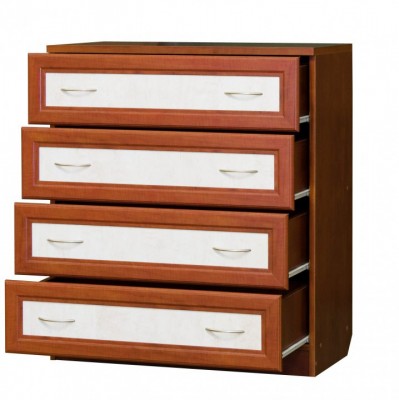 Комод оборудован четырьмя ящичками, дополненными выдвижным механизмом, в которых можно хранить различные вещи. Механизм движения состоит из прочных металлических и пластмассовых элементов, которые способны выдержать не одну сотню закрываний и открываний. Довольно часто такие комоды устанавливают в детских комнатах, поскольку в них очень удобно хранить одежду для детей. Ящички оснащены металлическими ручками удобной формы и дополнительным декоративным украшением в форме правильного четырехугольника, которое подчеркивает строгую красоту и изысканность этого предмета мебели. Внутреннее пространство выдвижных ящичков довольно большое, что позволяет хранить даже постельные принадлежности, благодаря чему комоды нередко располагают в спальных комнатах.