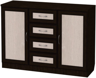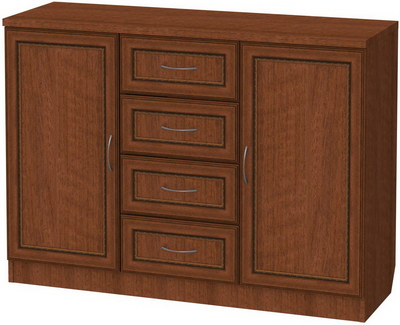 Высота изделия составляет 81.8 см, ширина – 112.6 см, глубина – 37 см. Такие габариты позволяют комбинировать эту модель с другими предметами мебели, создавая оригинальные ансамбли, либо использовать ее как самостоятельный элемент обстановки. Возможность выбрать определенный тип отделки, имитирующий цвет натуральной древесины, открывает простор для экспериментов: можно подобрать оттенок комода под цвет прочей мебели, расположенной в помещении, или же остановить свой выбор на контрастном варианте. У нас вы можете заказать комод с ящиками следующих оттенков: «молочный дуб», «ольха» и «дуб» - для интерьеров в светлых тонах, «ясень шимо» и «венге» - для помещений, декорированных в темной цветовой гамме.