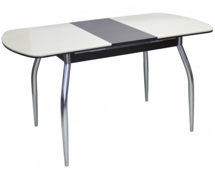 Раздвижной стол "Турин-1" (пр-во Россия). Комбинированная столешница: ЛДСП 10 мм и искусственный камень 12 мм. Центральная вставка - "бабочка" шириной 32 см позволяет легко разложить стол до размеров 70х142 см. Искусственный камень естественных расцветок является ударопрочным и практичным материалом. Полированная поверхность камня обладает мягким блеском. Торец ЛДСП облицован ПВХ-кромкой.